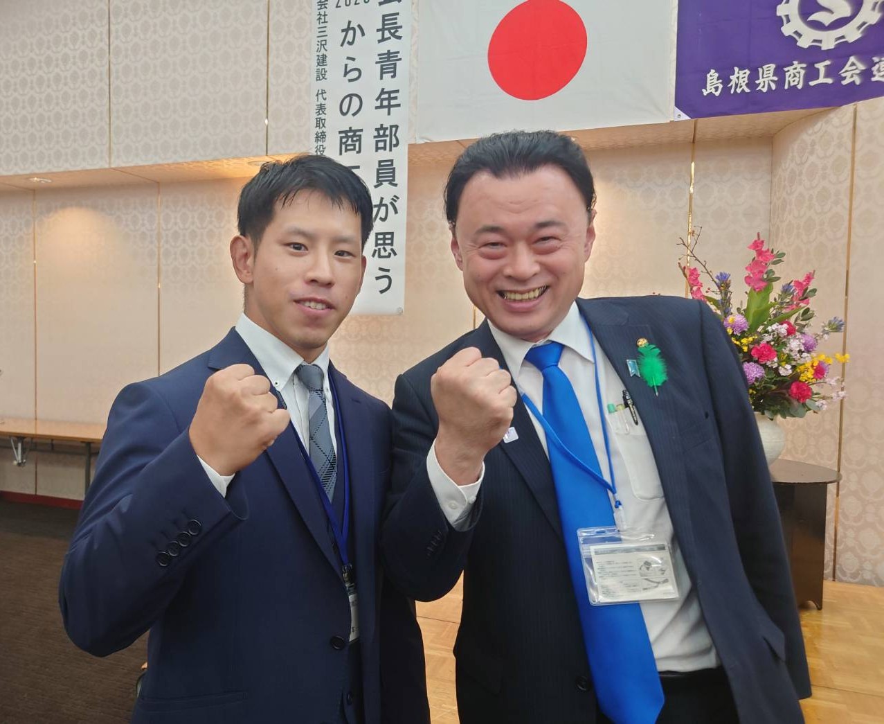 0月29日、松江市サンラポーむらくもで行われた「商工会しまね県大会」において、来賓にお越しになられた丸山達也島根県知事さんからも直接、激励をいただきました。丸山知事さんからは「前の試合も観ました。今回も頑張ってください!」との熱いエールをいただき、森本部長、さらに闘志を高めております。会場のKDDI維新ホール(山口県山口市)は山口県内最大の収容規模2,000席のアリーナです。会場も近く、会員の皆様の応援を宜しくお願いします!(丸山県知事さんからは、写真掲載についてご快諾いただきました。ありがとうございます!)